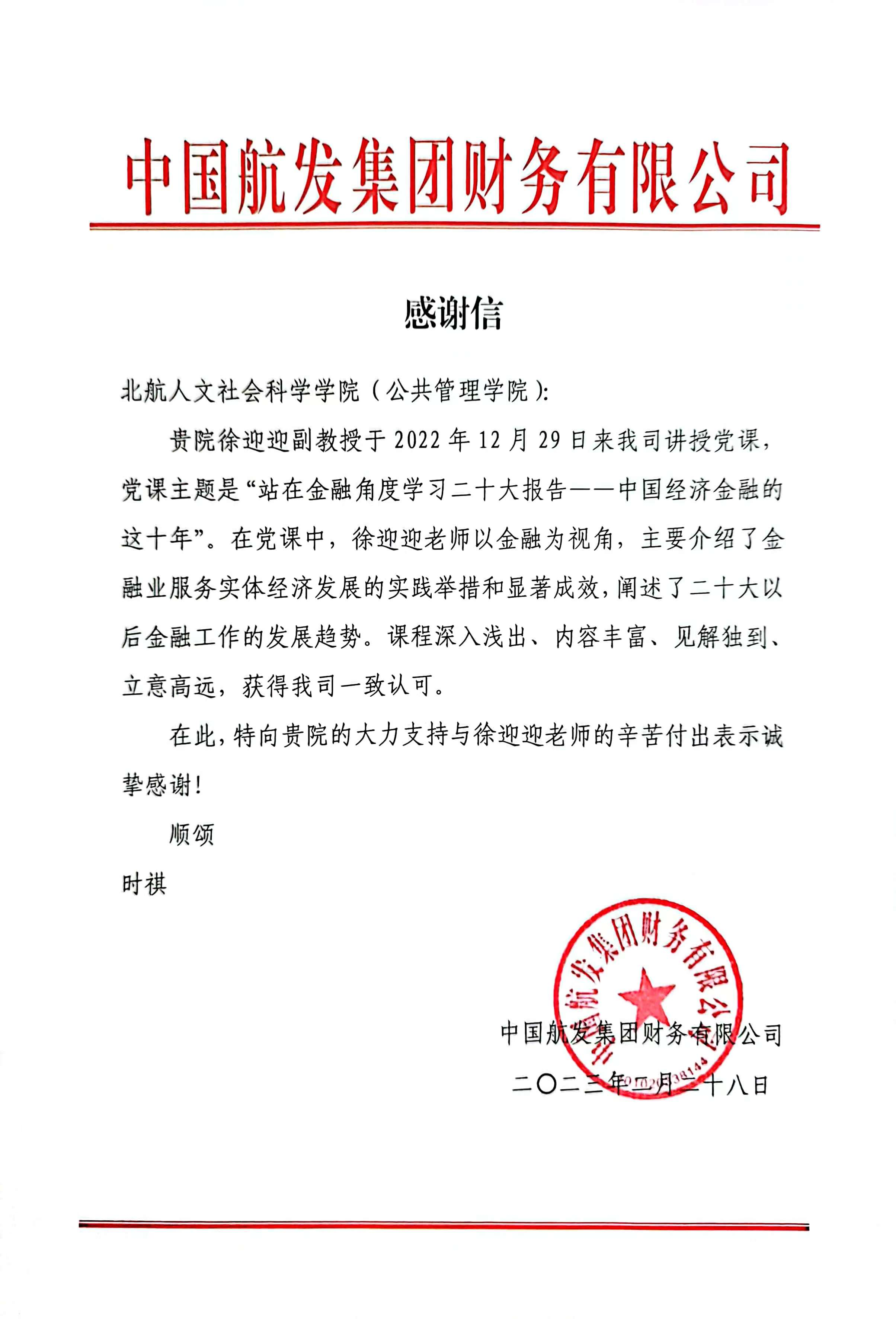 近日,304永利集团收到来自中国航发集团财务有限公司的感谢信。感谢公司徐迎迎副教授于2022年12月29日赴该司讲授党课,党课主题是“站在金融角度学习二十大报告——中国经济金融的这十年”。