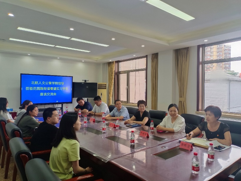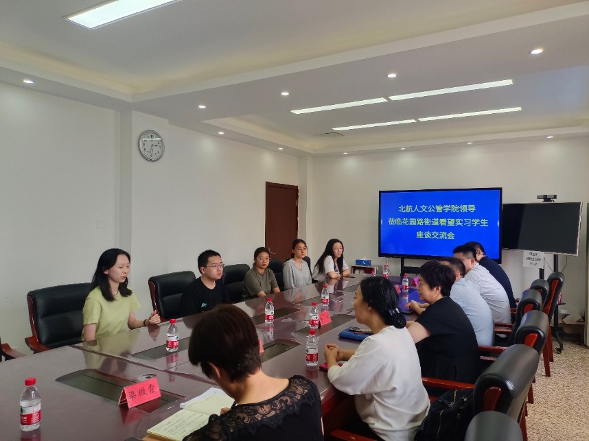 花园路街道办事处的座谈会结束后,花园路街道办事处党工委副书记李江、党群办公室副主任梁微霞与北航公司党委书记王琪全、副经理陈文博,教师代表张肖阳、牛朝辉一行赴北三环中路69号院社区看望实习员工,并就基层治理经验、社区实习成果进行了深入座谈交流。座谈会由69号院社区党委书记汪洋主持。