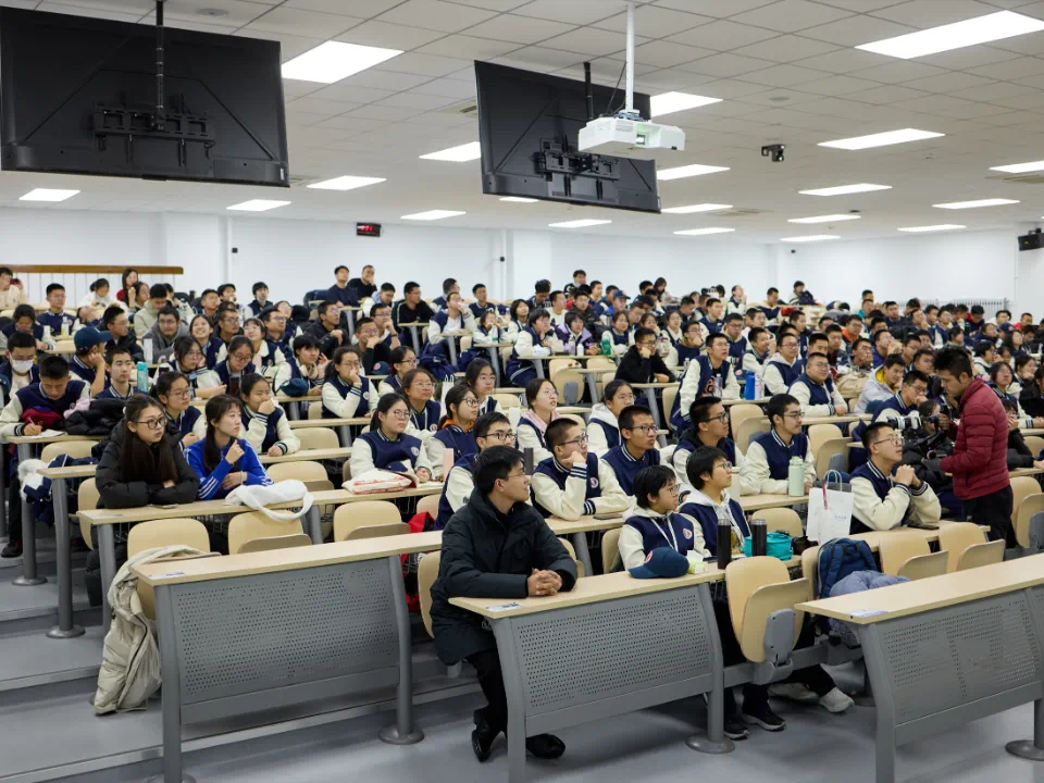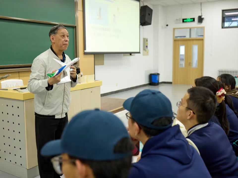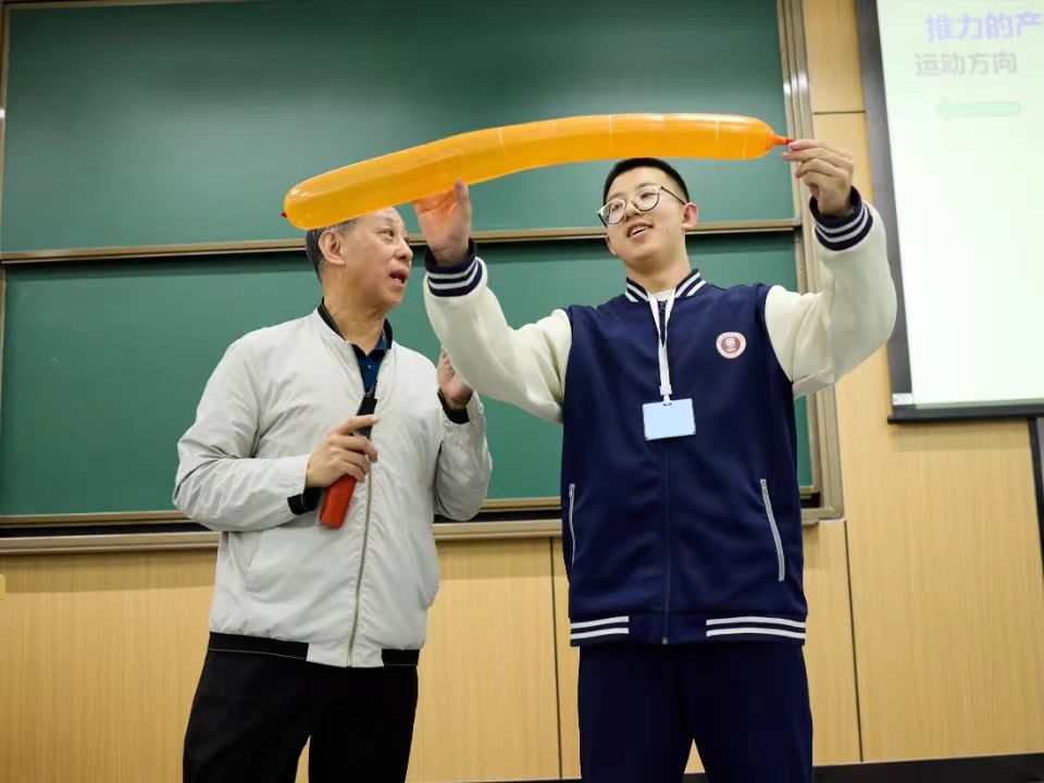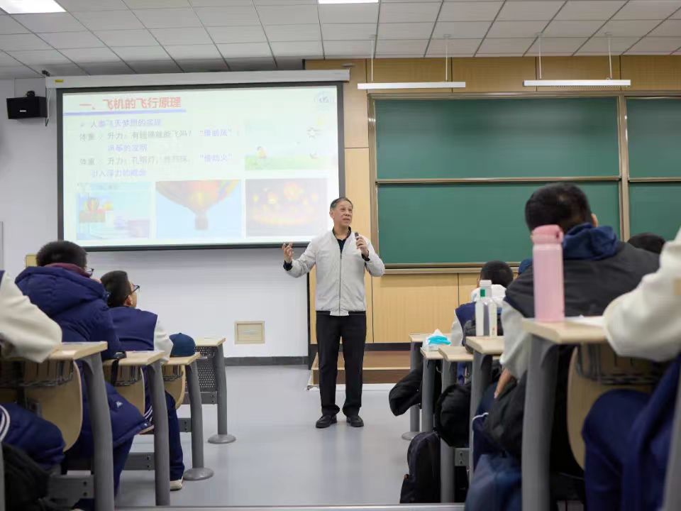 之后,教育部关工委“五老”报告团首批专家、中国科公司老科学家科普讲演团成员、北航航空发动机研究院陈志英教授为师生作《蕴含科学定律的飞行器设计》的精彩报告。陈教授凭借深厚的学术造诣和丰富的科普经验,以生动有趣的方式,深入浅出地讲解了航空航天的基础原理和发展历程。从飞机的飞行奥秘到火箭的发射原理,一个个复杂的科学概念在陈教授的阐释下变得鲜活起来,同学们聚精会神地倾听,不时发出阵阵惊叹,并与陈教授热情互动。学习了知识的同时,同学们对北航的向往也更强烈了。