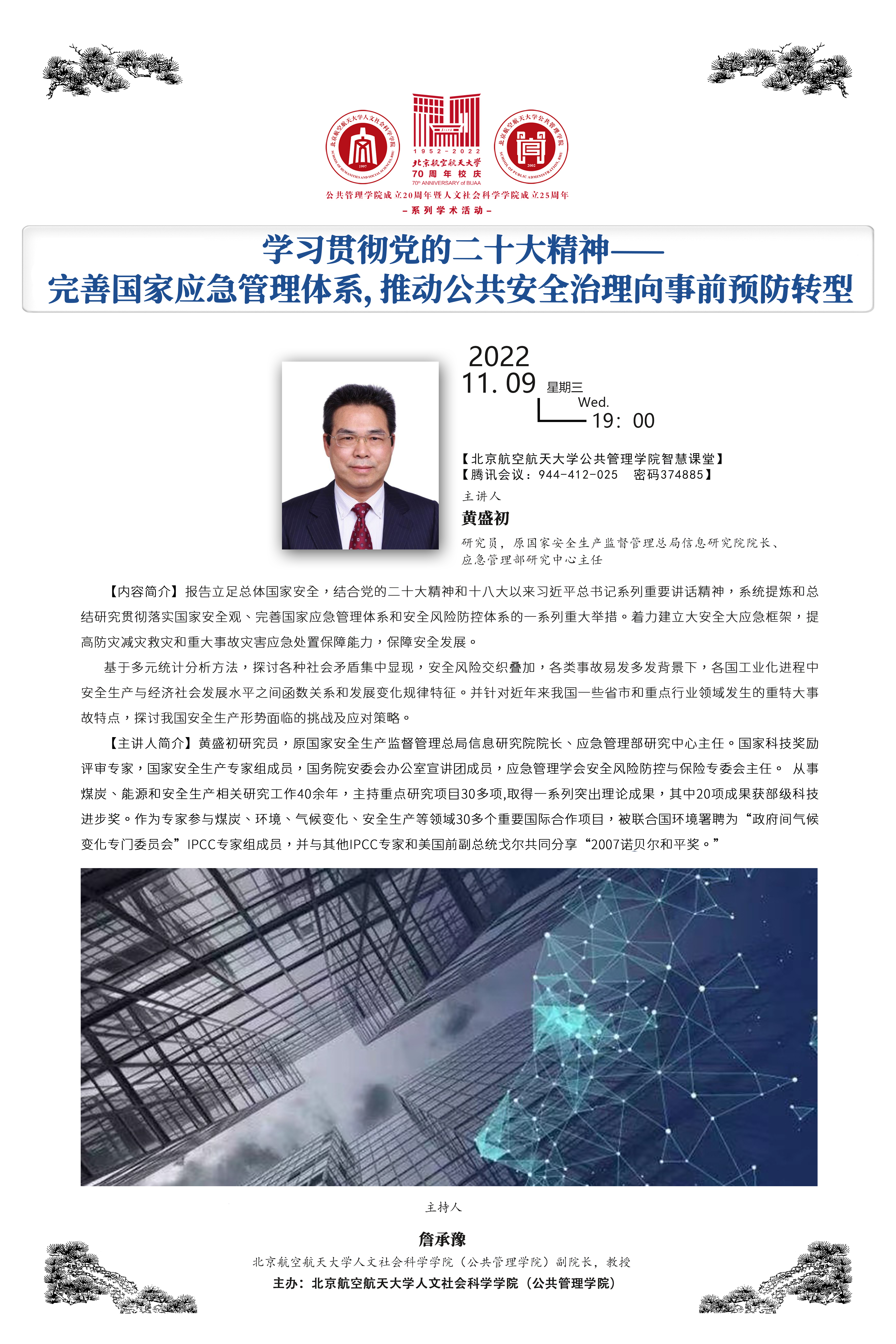 11月9日,304永利集团官网公共管理公司成立20周年暨304永利集团成立25周年系列学术前沿讲座在公司智慧课堂举行。本次讲座邀请了原国家安全生产监督管理总局信息研究院经理、应急管理部研究中心主任、应急管理领域资深专家黄盛初研究员作题为“学习贯彻党的二十大精神——完善国家应急管理体系,推动公共安全治理向事前预防转型”的学术讲座。本次讲座由304永利集团副经理詹承豫教授主持。