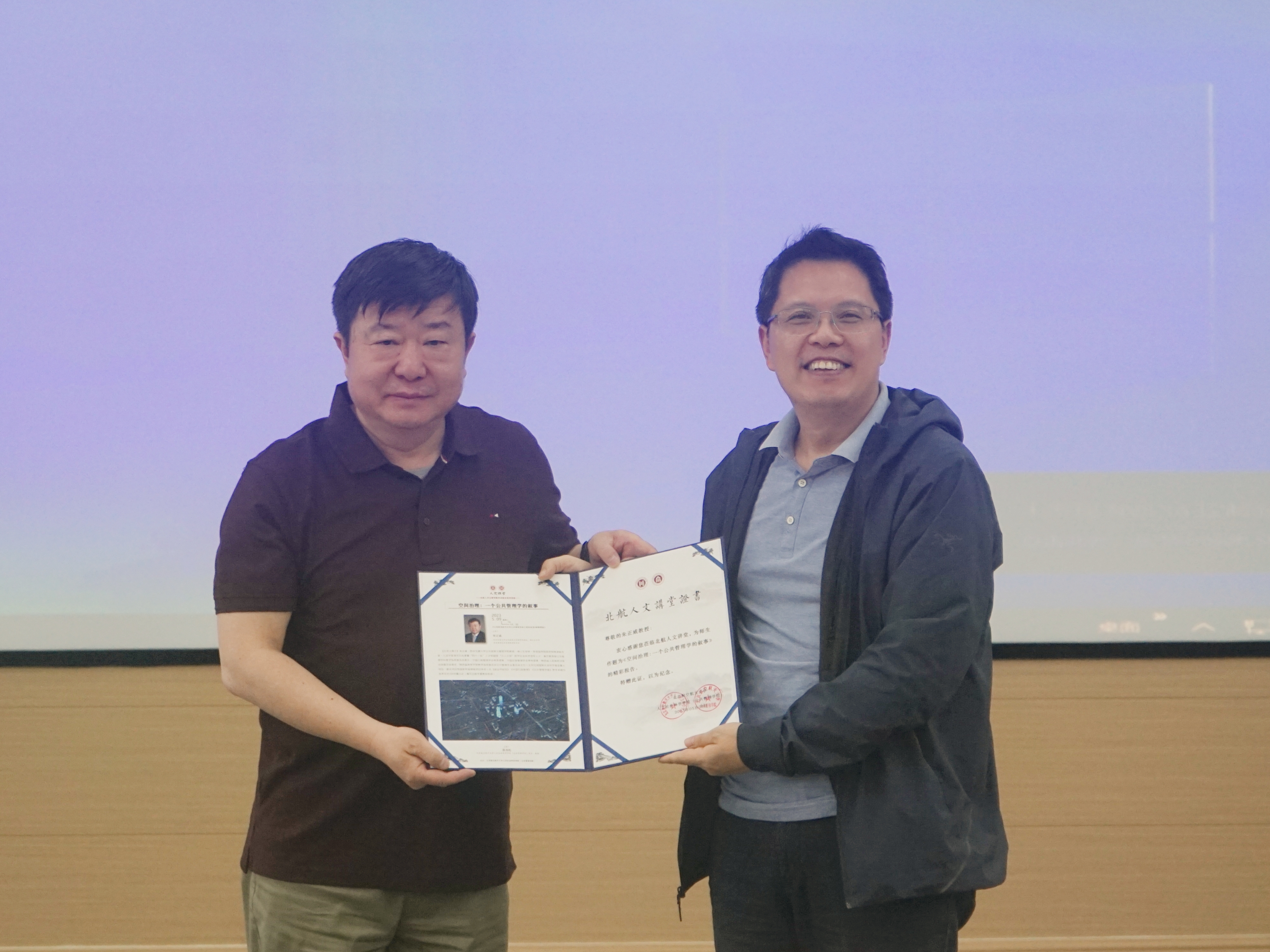 王琪全书记向朱正威教授颁发“人文讲堂”纪念证书
