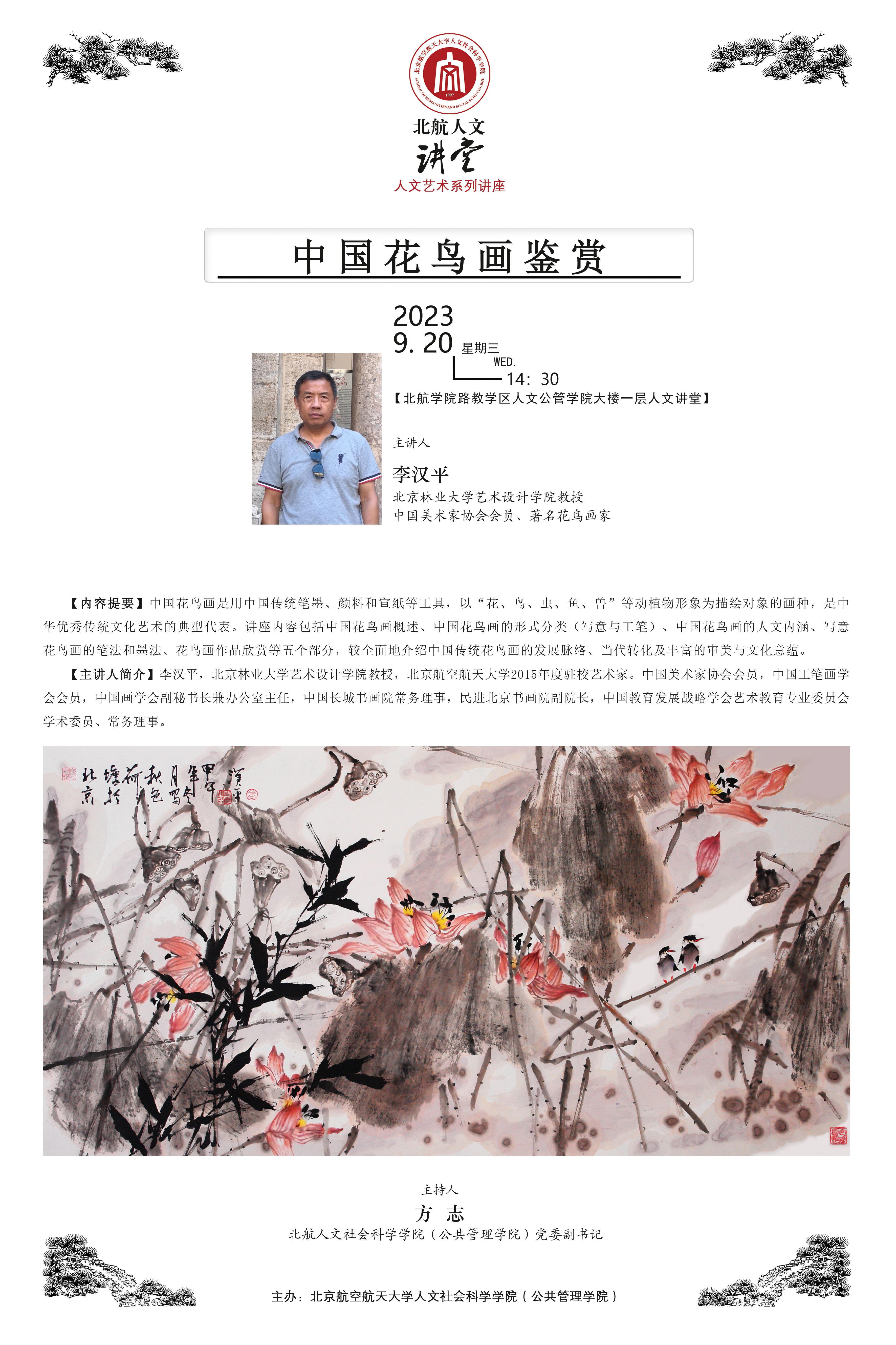 中国花鸟画是用中国传统笔墨、颜料和宣纸等工具,以“花、鸟、虫、鱼、兽”等动植物形象为描绘对象的画种,是中华优秀传统文化艺术的典型代表。讲座内容包括中国花鸟画概述、中国花鸟画的形式分类(写意与工笔)、中国花鸟画的人文内涵、写意花鸟画的笔法和墨法、花鸟画作品欣赏等五个部分,较全面地介绍中国传统花鸟画的发展脉络、当代转化及丰富的审美与文化意蕴。