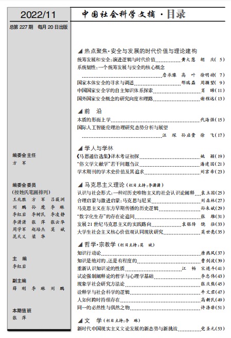 二是关于统筹发展和安全重要意义的研究。有学者认为,统筹发展与安全共同致力于实现国家富强、民族振兴、人民幸福的根本目标,构成相辅相成的辩证关系[11],是“由新时代中国社会面临的国际局势、所处的历史方位以及需要完成的中心任务所决定”[12],是历史的必然选择。还有学者强调,统筹发展和安全体现了“进入新发展阶段、贯彻新发展理念的必然要求”[13],并且体现了“马克思主义辩证唯物论的观点,是马克思主义基本原理与中国实际和时代特点相结合的又一理论创新”[14],牢牢把握住了发展和安全的协同关系,整体上反映了辩证、全面、系统的国家安全思想[15],是推动高质量发展,实现人民高品质生活,推进国家治理体系和治理能力现代化,顺利开启全面建设社会主义现代化国家新征程的内在需要[16]。