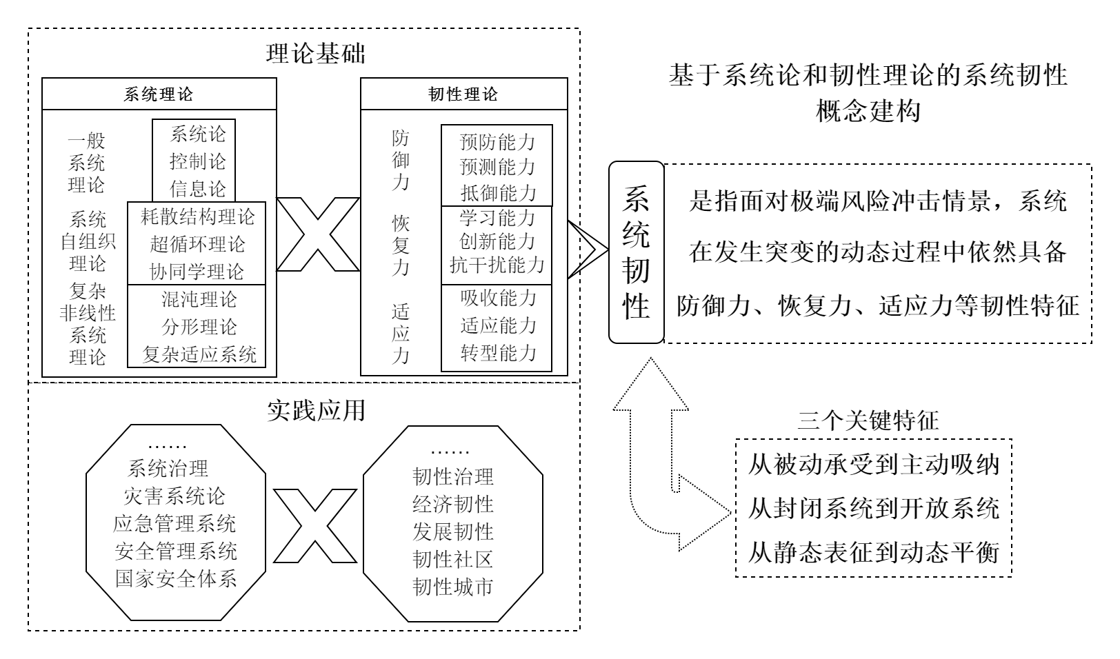 统筹发展和安全内涵丰富,战略意义重大,本文在对其内涵和现有研究理论应用状况进行分析的基础上,借鉴了系统论整体性、动态性、开放性、突变性、自组织性等核心思想,融合了韧性理论中关于防御力、适应力和恢复力等关键能力特征界定,构建系统韧性这一概念,以弥补当前研究中缺乏能够统领分散在各个实践和学科领域知识的核心理论概念问题。