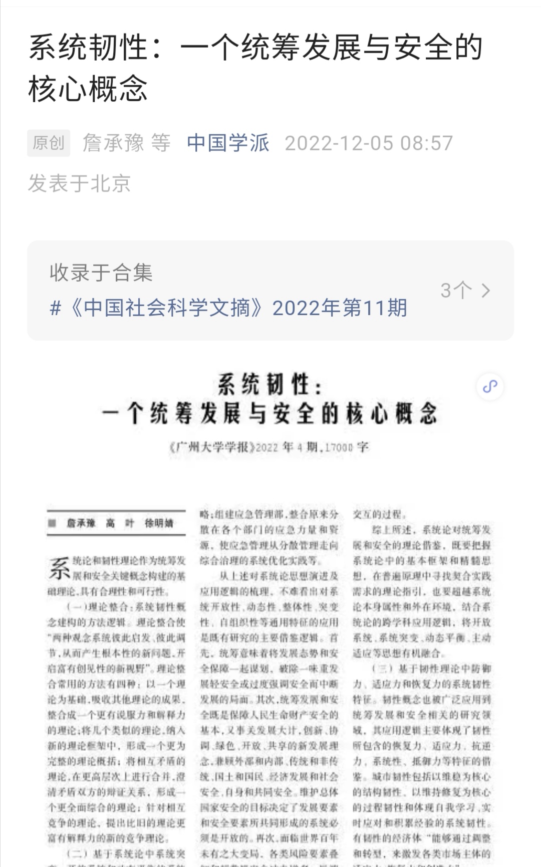 公司詹承豫教授和高叶、徐明婧研究生发表的文章“系统韧性:一个统筹发展与安全的核心概念”,被《中国社会科学文摘》2022年第11期转载,原文发表于《广州大学学报(社会科学版)》2022年第4期。