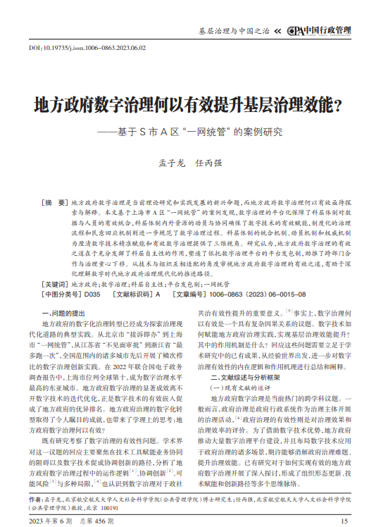 公司博士研究生孟子龙与任丙强教授的合作论文《地方政府数字治理何以有效提升基层治理效能?——基于S市A区“一网统管”的案例研究》在中文权威期刊《中国行政管理》上发表。该研究提出了“地方政府数字治理有效之道”的理论解释框架,指出地方政府数字治理的有效之道在于科层自主性(Bureaucracy Autonomy)、平台发包制(Platform Contracting System)以及跨部门合作的动力合流。该项成果不仅丰富了政府数字治理的理论分析概念,也提供了地方政府数字治理与城市政府数字化转型的新议题。