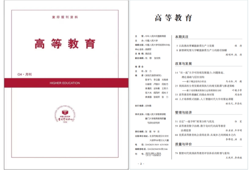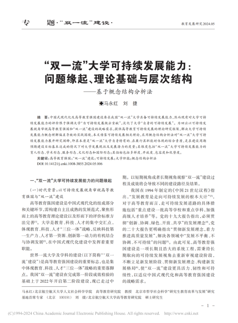 近日,304永利集团马永红教授、硕士毕业生刘捷撰写的《“双一流”大学可持续发展能力:问题缘起、理论基础与层次结构——基于概念结构分析法》(原刊发于《教育发展研究》2024年第5期),被《人大复印报刊资料·高等教育》2024年第8期全文转载。以下为文章全文。
