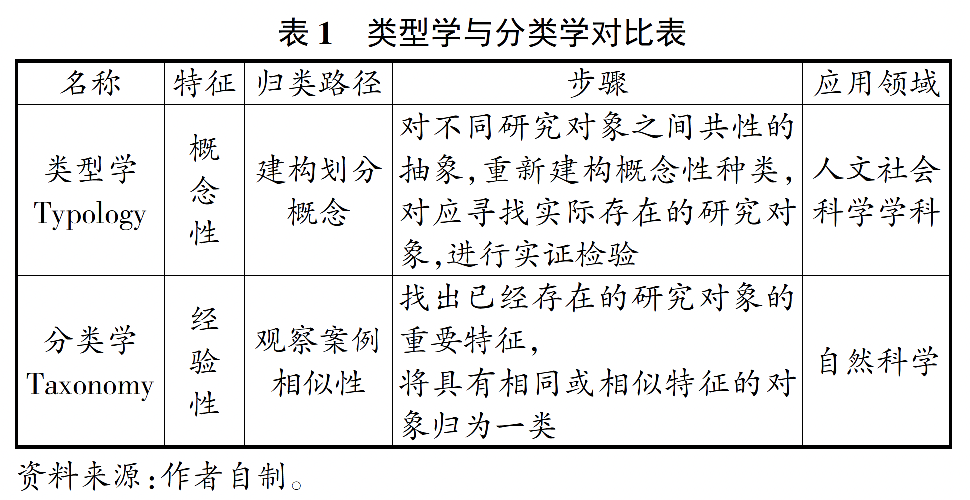 类型学是一种分组归类的认识方法论,在研究过程中有不少学者将其与分类学混淆。[14][15]许多文章宣称使用了类型学方法,但实际却使用的是分类学。[16]显然,学者们并未清楚区分类型学与分类学两种研究方法之间的差异。类型学与分类学本质都在于把事物进行归类,是分组归类认识方法论的两种路径。[17]它们主要区别在于前者侧重概念体系,后者侧重经验体系(见表1所示)。