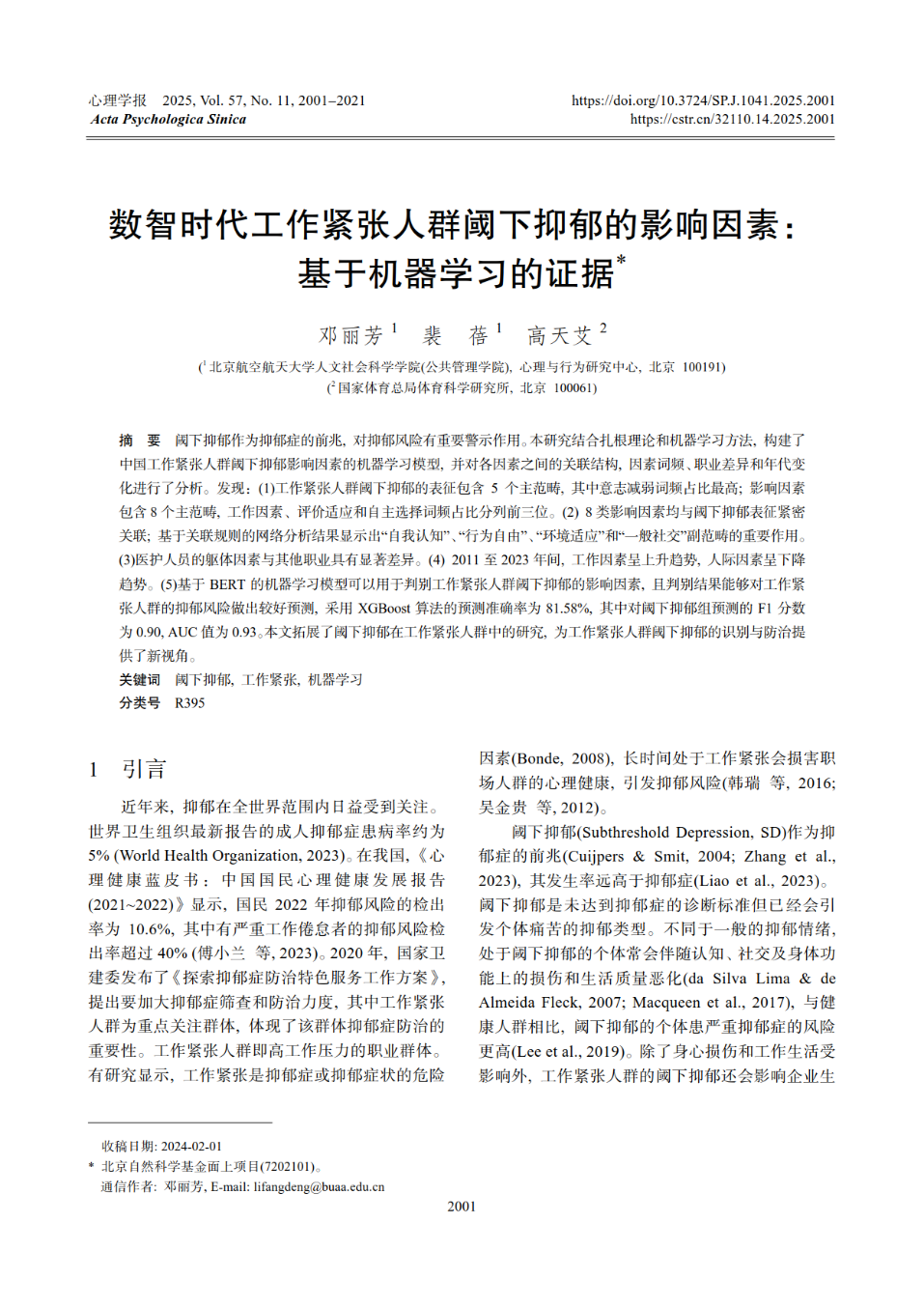 近日,《心理学报》刊发304永利集团邓丽芳教授、博士研究生裴蓓、硕士毕业生高天艾的论文“数智时代工作紧张人群阈下抑郁的影响因素:基于机器学习的证据”,该论文发表在《心理学报》“人工智能心理与治理”栏目,研究关注高压力工作人群的抑郁风险识别,采用机器学习等方法,为工作紧张人群阈下抑郁的识别与防治提供了新视角。