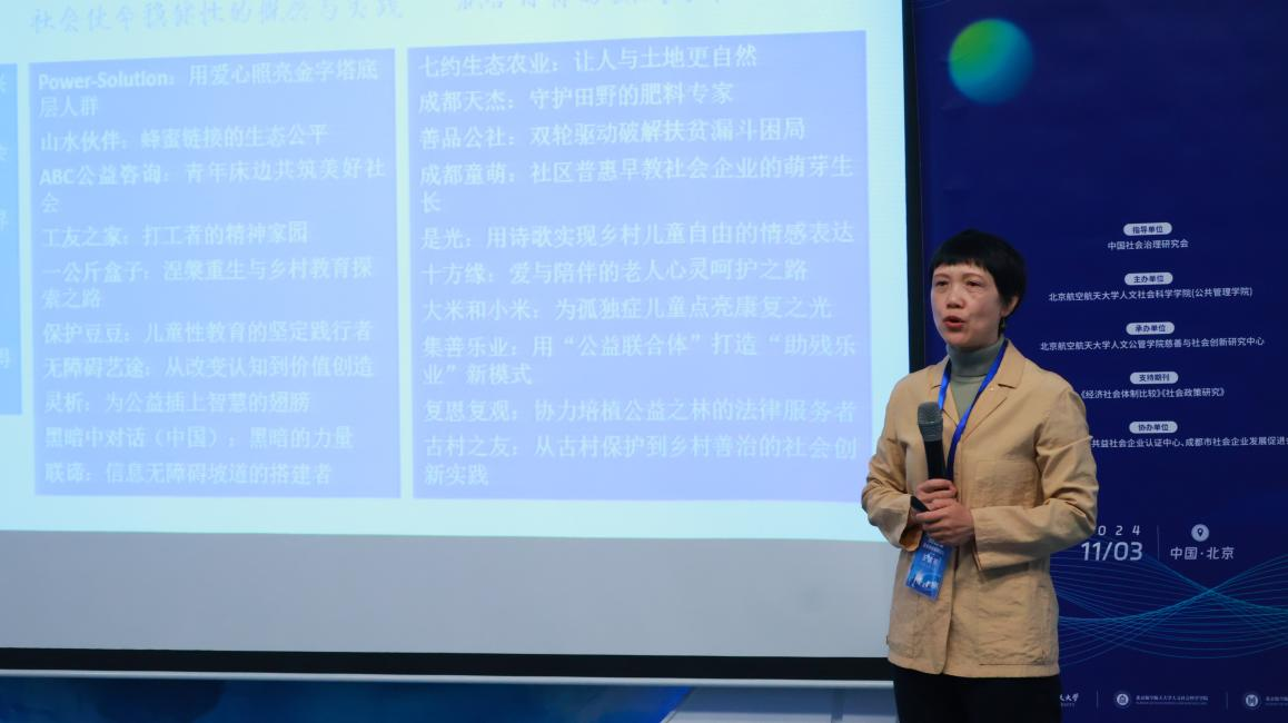中国人民大学商公司王建英副教授围绕《从个案调研看中国社会企业双目标的管理实践》进行分享。她指出,人大商公司自2017年起致力于社会企业教学案例开发、教学及社会企业家精神倡导。目前已出版三本相关案例集,其主题分别是创造性地破解社会难题、社会使命稳健性的概念与实践、混合目标的挑战与管理。紧接着,王教授从学术研究角度,分享了案例企业的理论关注点,如创业过程模型、创业者特质、企业战略要素多元化战略等等。最后,她从控股类型、机构协同、内部张力、利益相关者沟通等方面阐述了如何进行混合目标的管理。