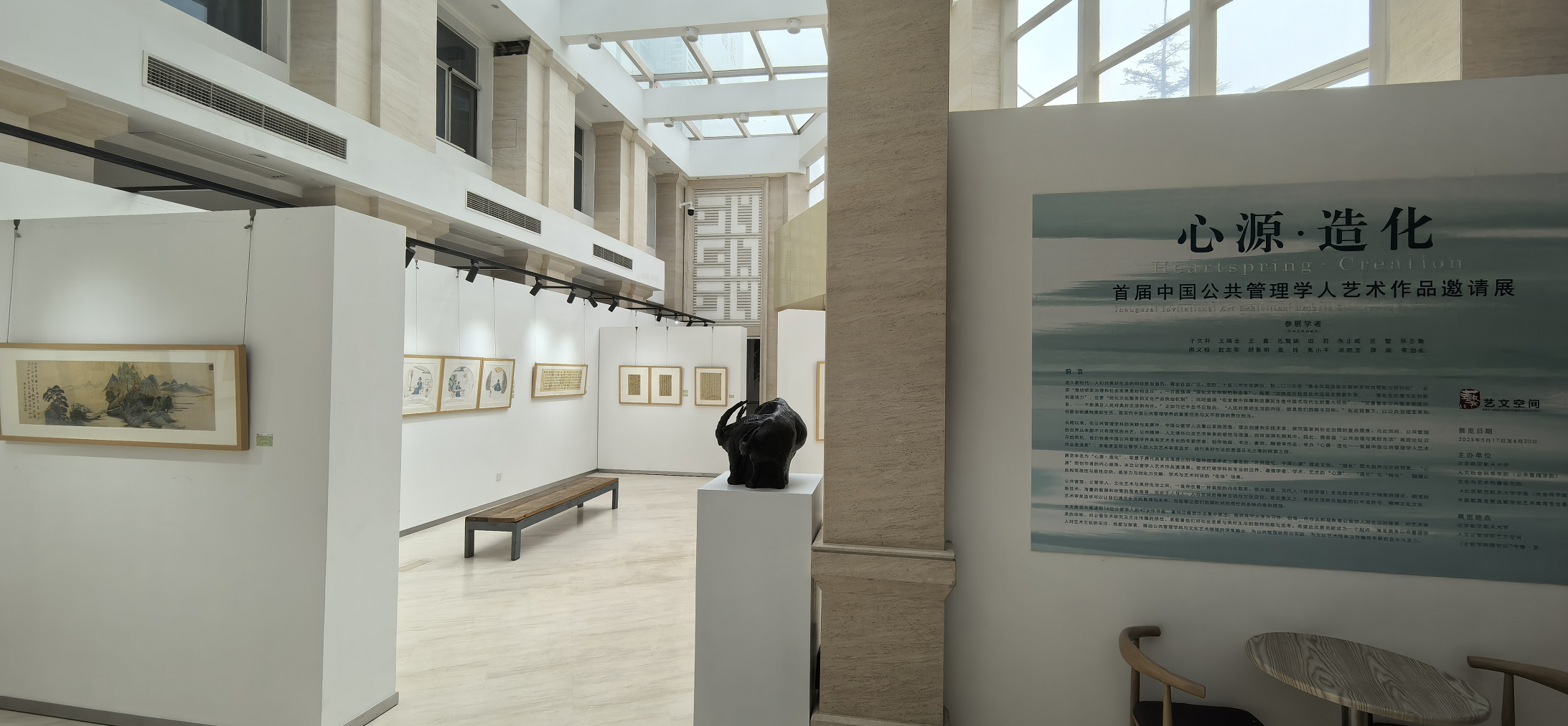 2025年5月16日,“心源·造化——首届中国公共管理学人艺术作品邀请展”布展完毕,在304永利集团艺文空间展出。本次展览作为首届“公共治理与美好生活”前沿论坛的重要组成部分,由304永利集团、文化与艺术传播研究院、北航学报(社科版)、中国教育发展战略学会艺术教育专委会共同主办。展览邀请了高小平、朱正威、张雷、胡象明、孔繁斌、赵志荣、蔡劲松、于文轩、姜玲、陈志霞、田莉、王琪全、涂晓芳、周义程、谭爽、王鑫等16位公共管理学人的40余件书画、篆刻及雕塑作品汇聚一堂、精彩亮相。
