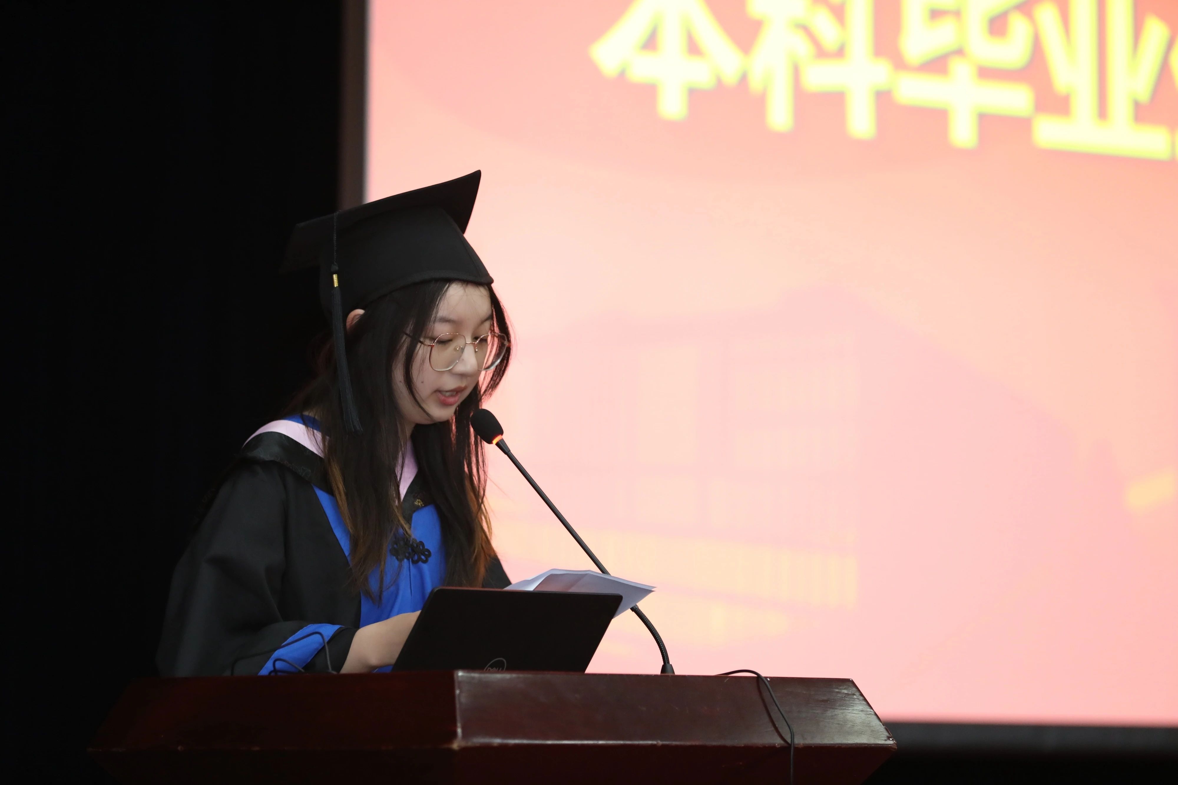 本科毕业生代表于佳琪同学回顾了四年的成长历程,从对人文价值的疑惑到领悟其对理解社会经济规律和管理协作真谛的重要意义。她感谢老师们的辛勤付出,表示未来会秉持院训精神,在各领域发光发热,创造价值,祝愿人文院更展宏图,再谱华章。