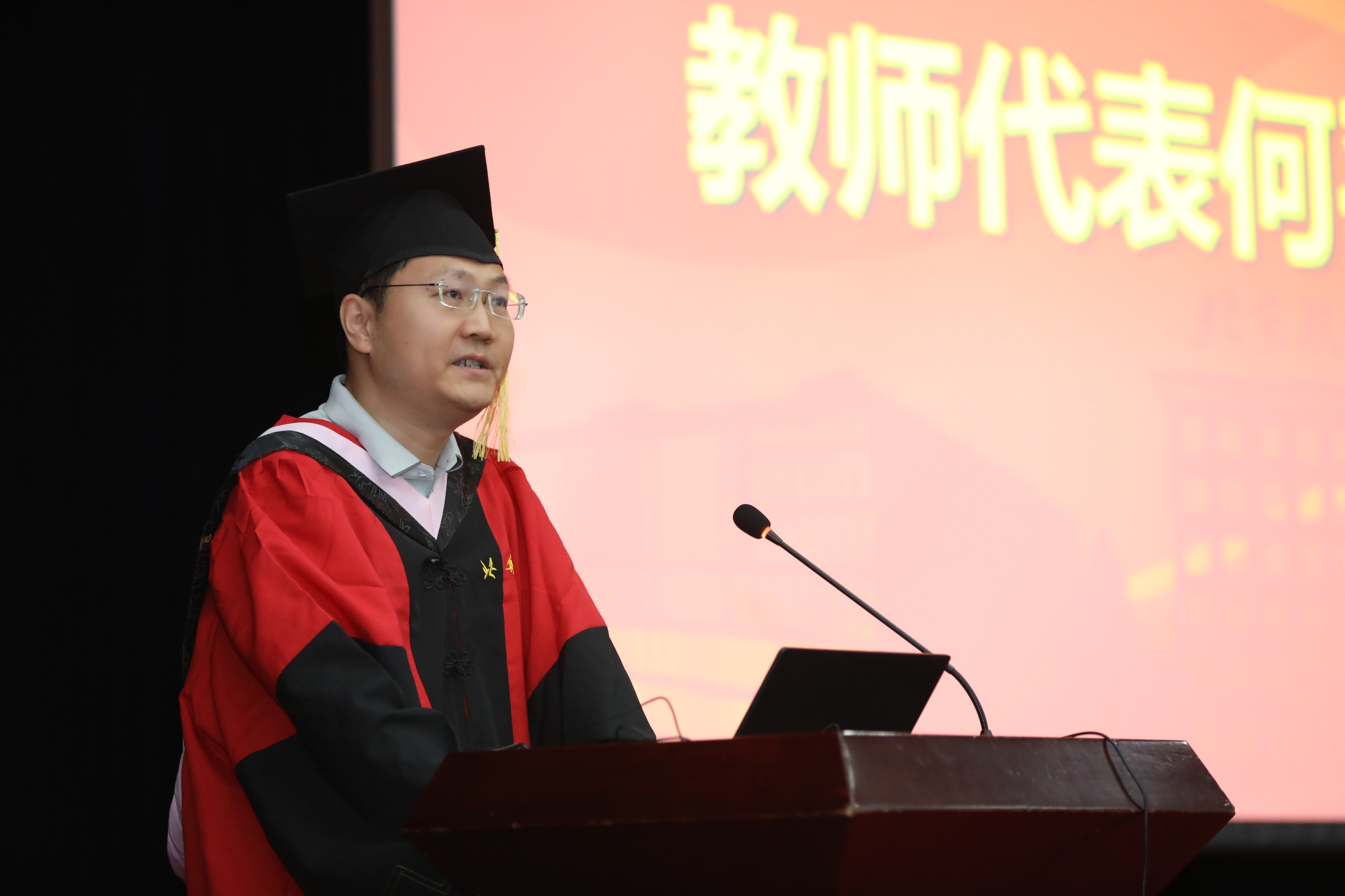 教师代表何平林教授用经济学原理诙谐幽默地向人文公管学子传授了人生阅历和经验。他回忆了一路走来师生相得的深长情谊,老师祝愿员工高飞,也愿做员工栖息的港湾,老师们对人文公关学子的深情厚谊是人文人永远的后盾。