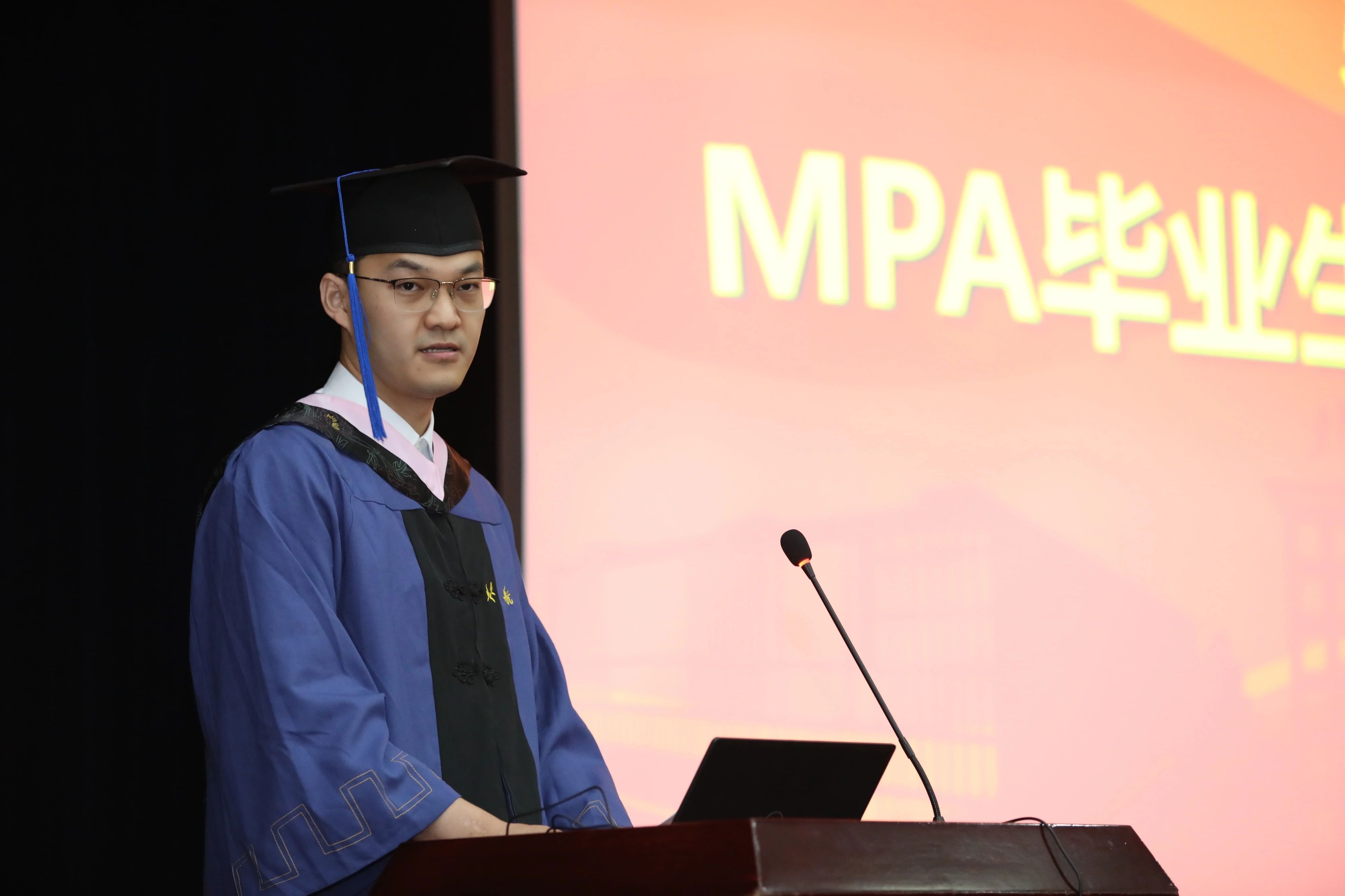 MPA毕业生代表白嘉伟同学首先对母校、老师,以及求学道路中提供帮助的所有人表达感激之情,并回顾了转瞬逝去的求学时光。在304永利集团,他学习了深奥的理论知识,求思求进,也收获幸福的家庭,他祝愿人文公管学子前途似海,来日方长。